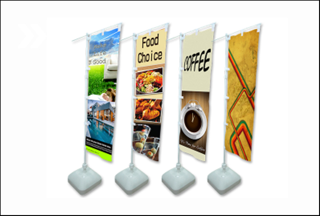 店舗やイベント会場での商品の告知・キャンペーンなど、幅広い場面で使える定番の商品です。サイズは大小2種類からお選び頂けます。専用のポールを使用して設置します。