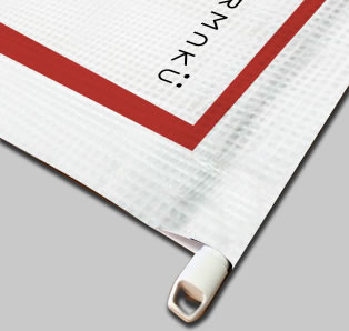 定番加工です。幕の4辺を熱圧着し、ハトメを止めてその穴からロープを通し設置可能です。