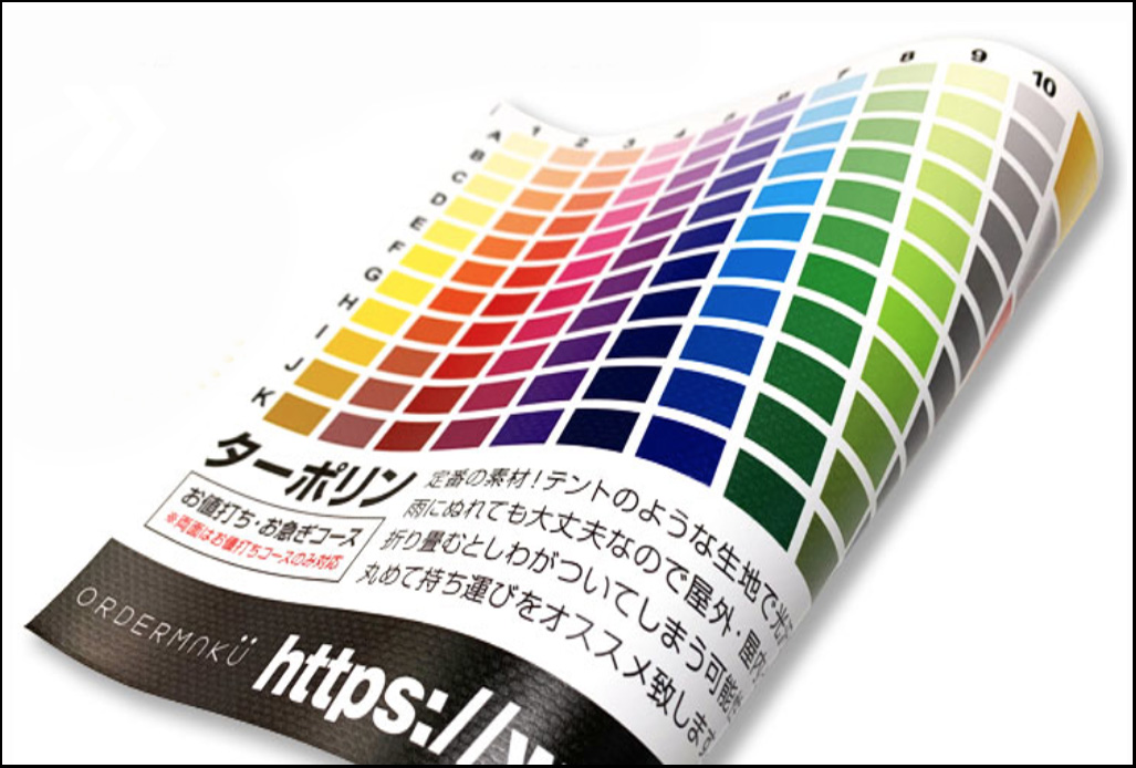 ターポリンとは運動会のテントのような生地で、印字性や発色に優れた薄手でしなやかな素材です。 強度もあり、水にぬれても大丈夫な為、屋内外に使用でき、長期常設向けです。