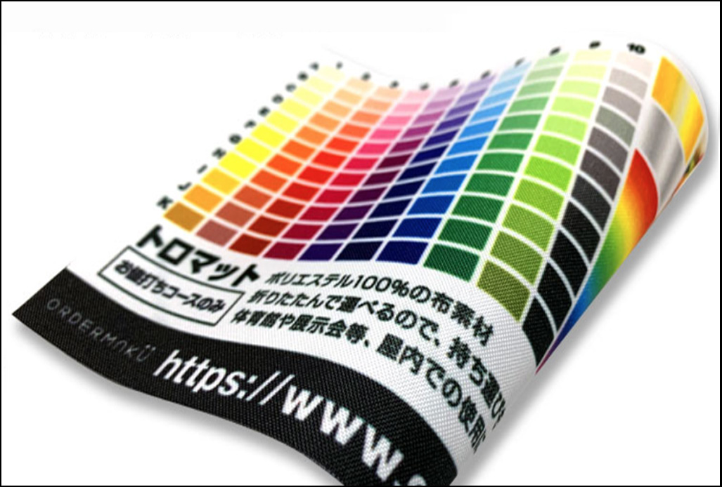 トロマットは裏側への透けが少なく鮮やかな発色のポリエステル織物で、丈夫で軽く折りたため、持ち運びに便利です。 繋ぎ、フチ周り補強は糸による縫製となります。長期の屋外常設には向きません。