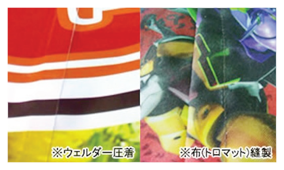 ウェルダー加工とは、ターポリン・メッシュを溶かして圧着する熱処理加工のことで、ミシンで縫製するよりも頑丈・高品質で糸が表面に出てしまうこともありあません。