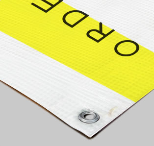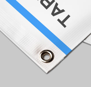 定番加工です。幕の4辺を熱圧着し、ハトメを止めてその穴からロープを通し設置可能です。